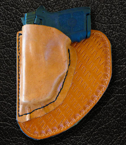Tucson Leather Works produces Stealth Holsters of our own design. These relatively inexpensive pocket holsters are designed for the new generation of small automatics and are configured to fit the exact shape of your pocket. The combination of leathers produces a holster with just enough grip on the gun to keep it in place and is extremely comfortable. In addition, the gun is positioned perfectly for a quick removal just below the lip of the pocket and will not rotate like many pocket holsters on the market.The low price makes it affordable to have one holster for jeans and another for dress pants. Left, right or back pocket options are available.